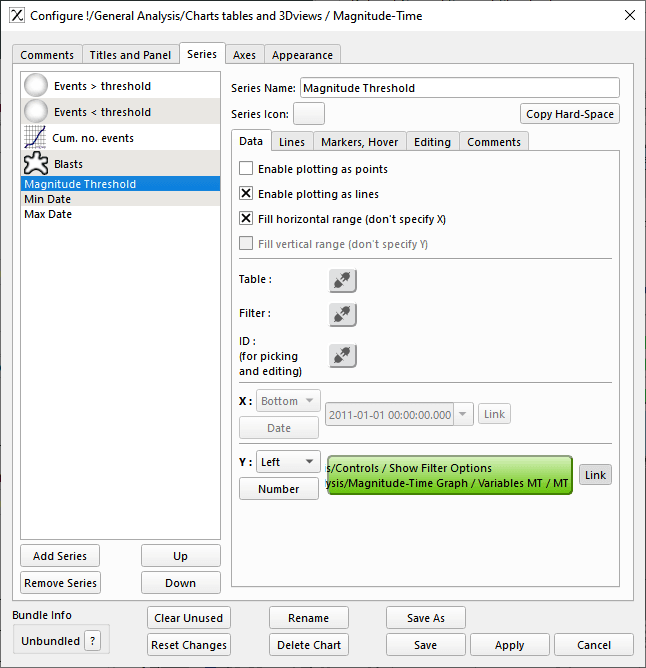 The ability to specify a single value rather than a column is also a new feature. If both the X and Y are specified as single values, or if one is a single value and the other is not specified (as with the magnitude threshold below), then no input table is needed at all. This simplifies many cases where developers previously had to create new tables in order to plot single values, indicator lines, thresholds, etc. In order to change between single values and columns, simply click on the type button for that axis (e.g. Date for X and Number for Y in the below image) and choose either the column or single value types.