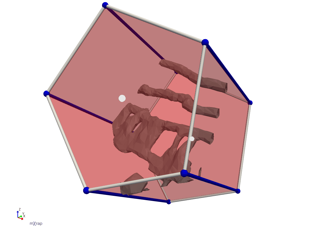 mXrap 6.1 has extended the 3D clipping feature to support more general clipping volumes. Previously clipping volumes were restricted to axis-aligned bounding boxes, specified using a minimum and maximum XYZ. The more general clipping volumes support shapes that can be created using the 3D View's selection box system, as shown below.