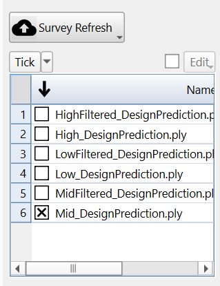 - Predicted surfaces selected in panel. There are 6 surfaces generated filtered and non-filtered versions of the low, medium, and high cases corresponding to the prediction thresholds previously specified.