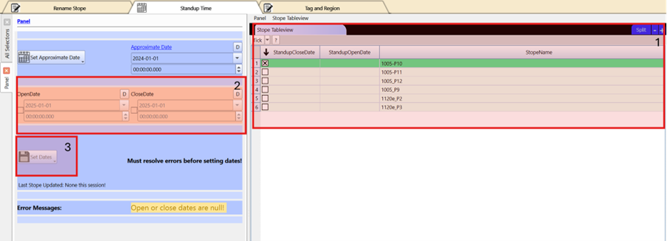 This tool allows users to edit standup dates for a stope.