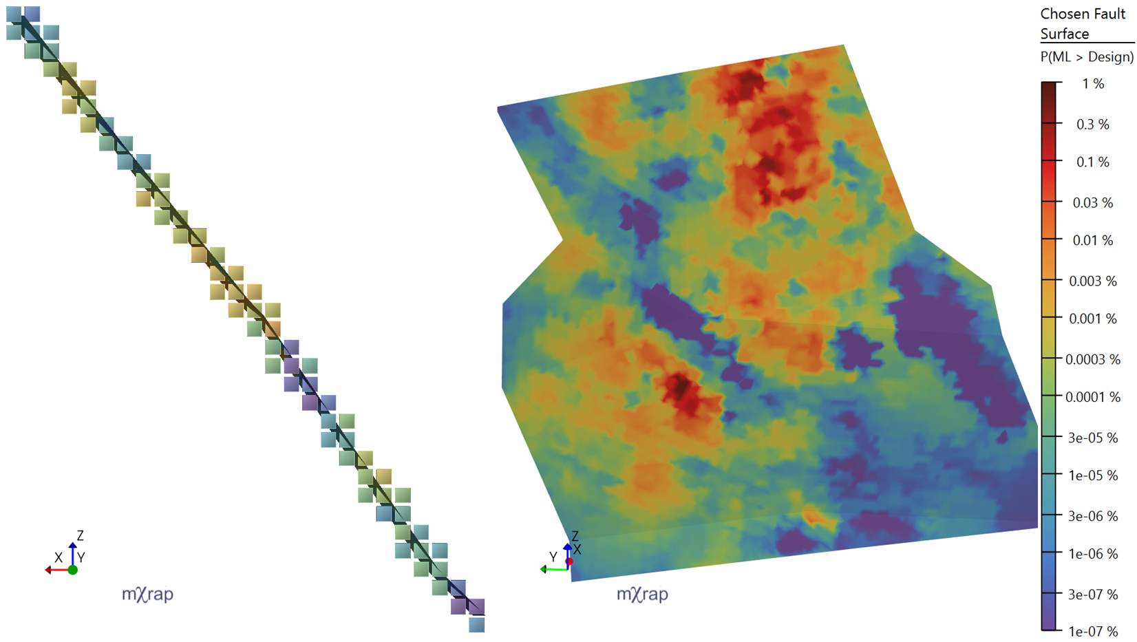 The intention of this module is to help understand which faults are triggered by nearby blasting and to quantify the hazard associated with each fault on excavations. Understanding and quantifying the role of structures on your seismicity is critical in assessing your current seismic risk, and the risk with future excavations near active faults. The app may also be useful to determine which structures should be included explicitly in numerical modelling and measured for calibration, as numerical models should reflect the seismic behaviour that is observed on key structures.