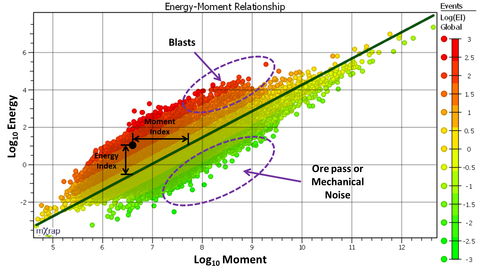 If you are doing your own energy index calculations, or using different software, you should be aware of the method used to define the energy-moment relationship and the linear constants used. The least squares approach or chi-square regression should be avoided. The QQ based method is the approach used in mXrap and you can find the fitted linear equation in the footer of the energy-moment chart. You might see different parameters for "global" energy index and "local" energy index. This distinction comes from the different energy-moment relationships used. The global EI relationship is based on all events that pass the quality filter. The local EI relationship is based on events that pass the current base filter (volumetric, parameter ranges etc.).