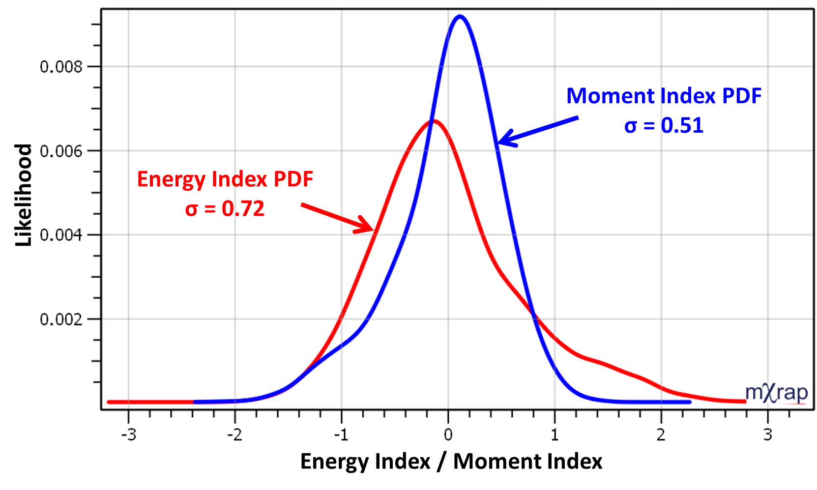 The figure below shows the difference between the QQ fit and the least squares fit of the energy-moment data at the Unicorn Gold mine. The QQ fit is a better match to the highest point density zones. The poor LSR fit is because the variance in energy is higher than the variance in moment. The distribution of the energy and moment departure indices is plotted below. Both distributions are slightly asymmetrical, likely due to the various seismic mechanisms superimposed. The wider variance in the energy index introduces a bias that has the effect of making a shallower least squares fit as it tries to minimise the vertical departure in the centre of the chart.