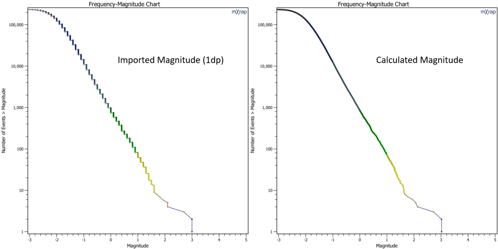 In mXrap, local magnitude can be imported along with the other event details from your seismic service provider although this does have low precision which can effect some of the charts and calculations. The reason for the 'stepping' sometimes seen in the frequency-magnitude chart is due to an imported local magnitude of only 1dp precision.