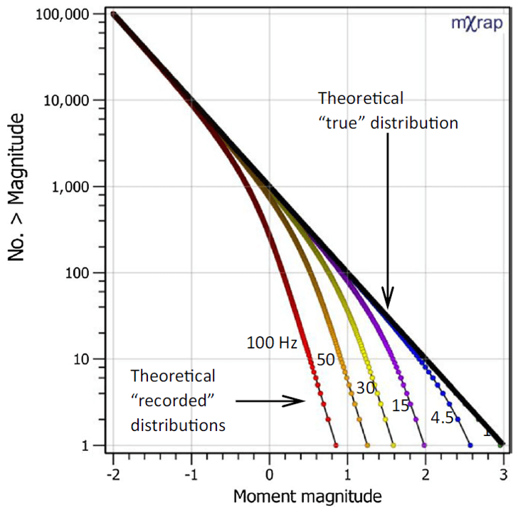 These statistical approaches assume the recorded magnitudes of large events are reliable. Moment is under-recorded for large events if there are no low-frequency sensors installed. The figure to the left comes from Morkel and Wesseloo (2017)5 showing the effect on the frequency-magnitude relationship, given certain sensor bandwidth limitations.