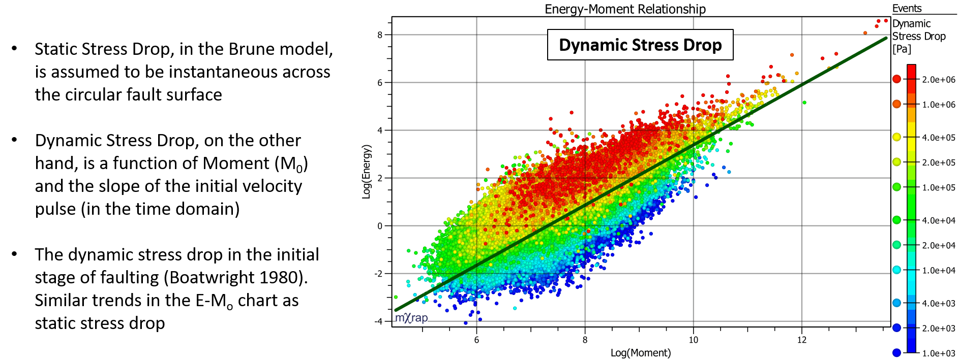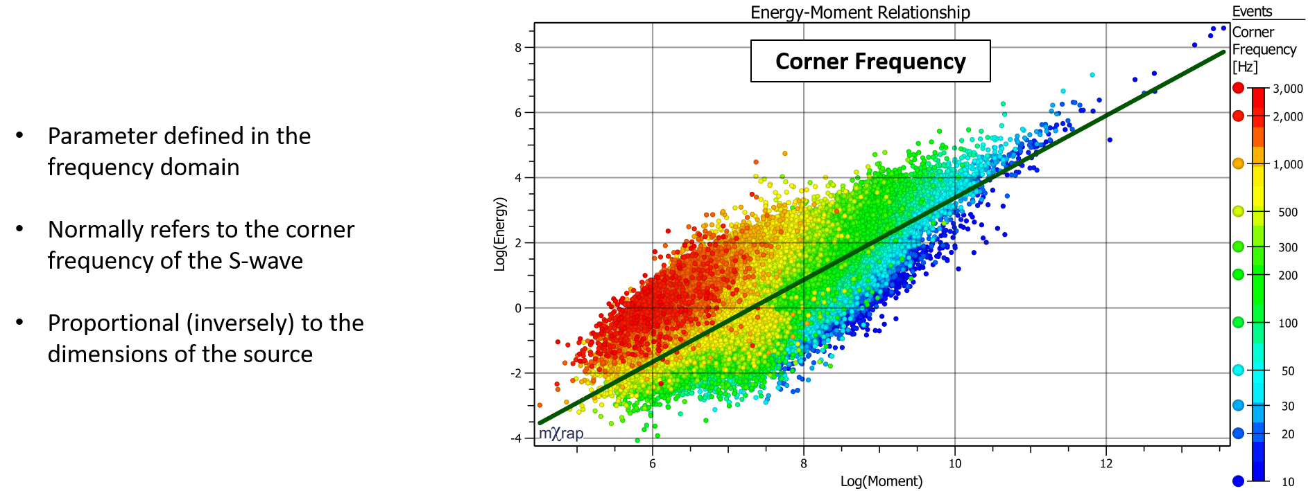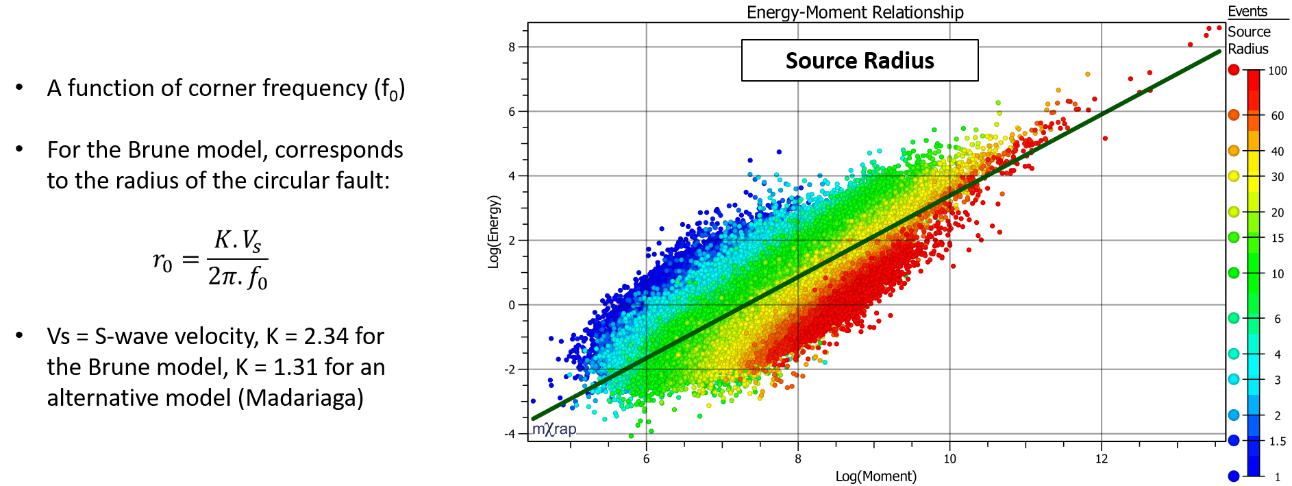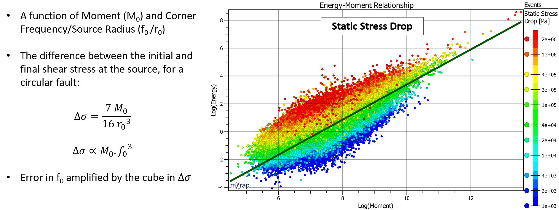 Many commonly used source parameters are derived from Energy, Moment and Corner Frequency. Below is a quick guide to these parameters, illustrated with an Energy-Moment chart that has events coloured by the relevant parameter.