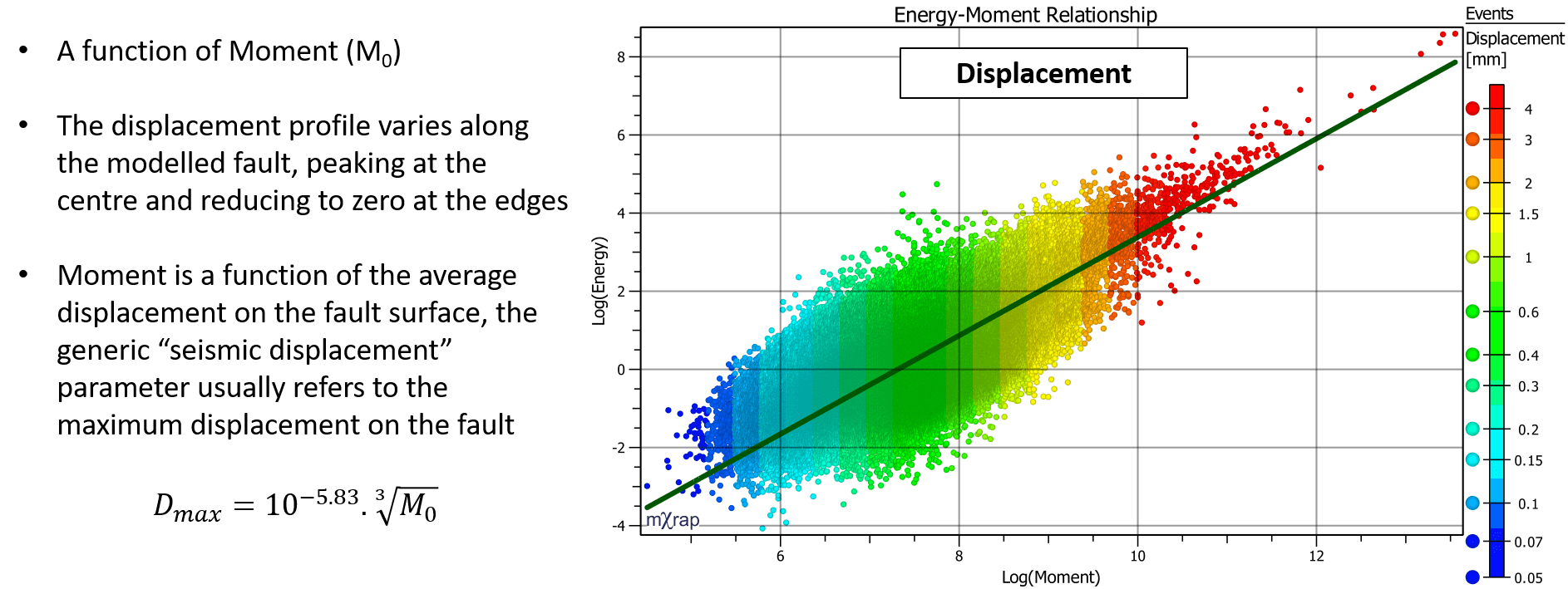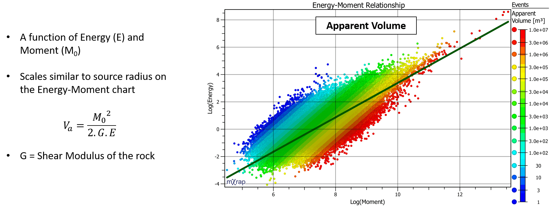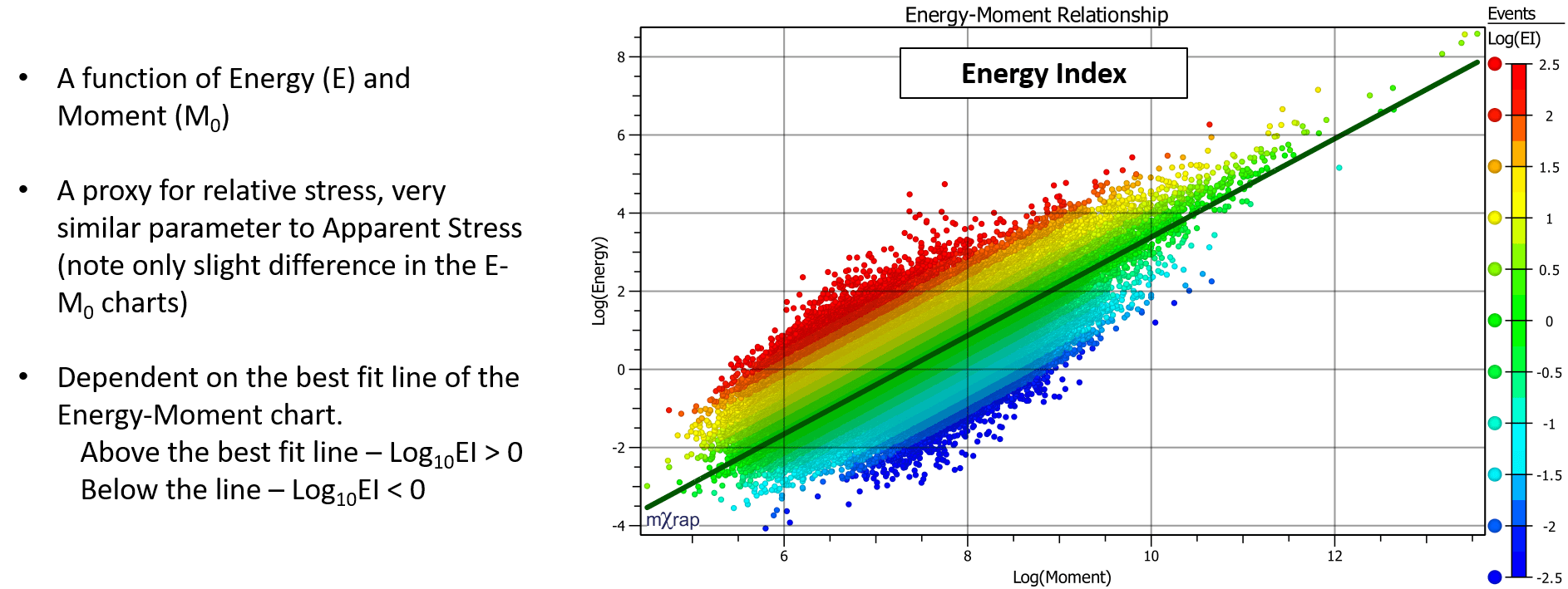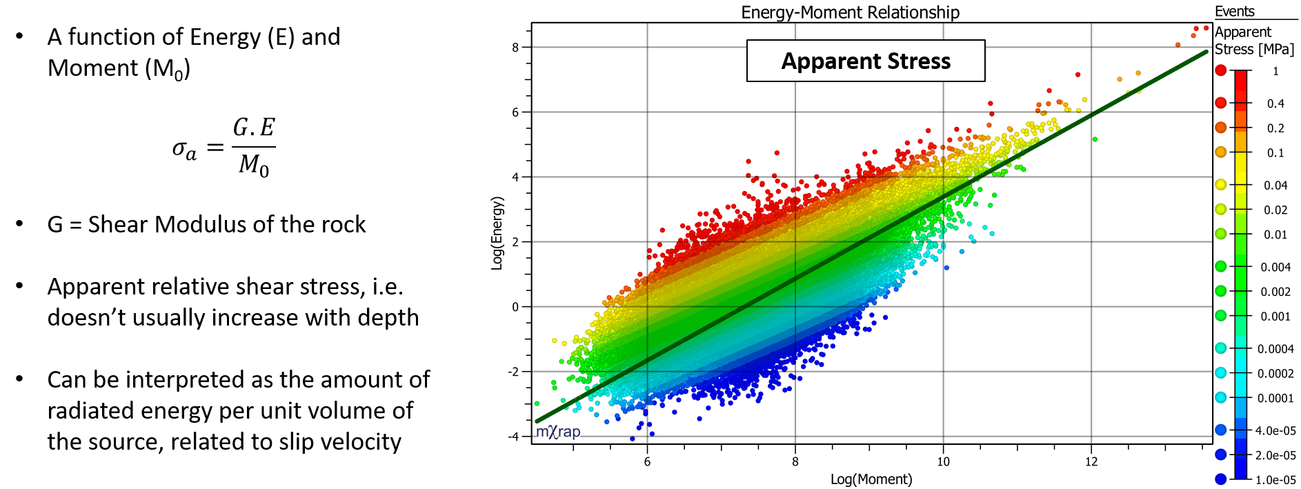 Many commonly used source parameters are derived from Energy, Moment and Corner Frequency. Below is a quick guide to these parameters, illustrated with an Energy-Moment chart that has events coloured by the relevant parameter.