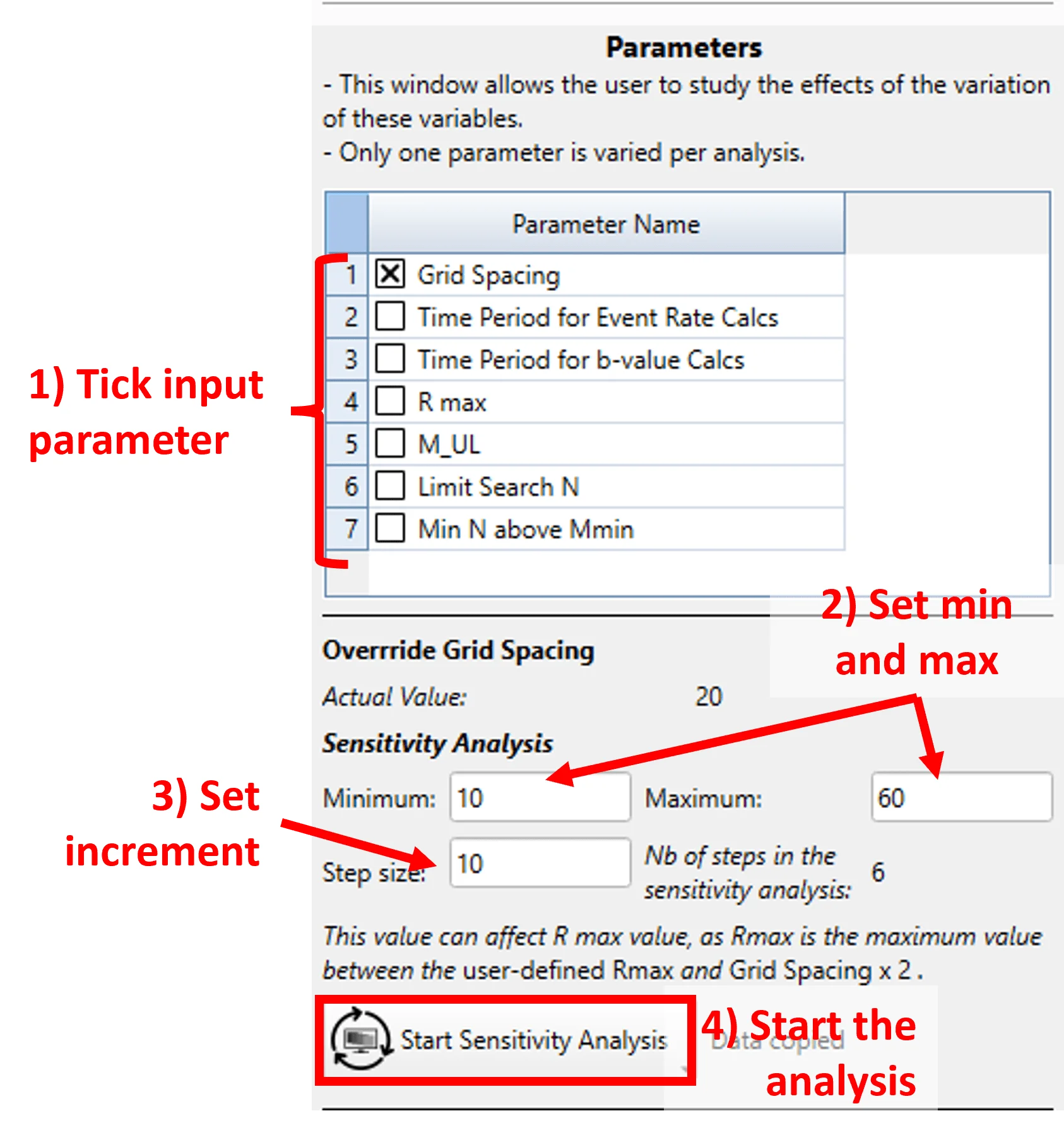 A new window has been added to the Hazard Assessment app (Figure 1). The sensitivity analysis aims to quantify the effect of the variation of the input parameters on the hazard. These analyses can also help the user to determine the optimal settings to use for many of the parameters. This window allows the user to vary only one parameter at the time.