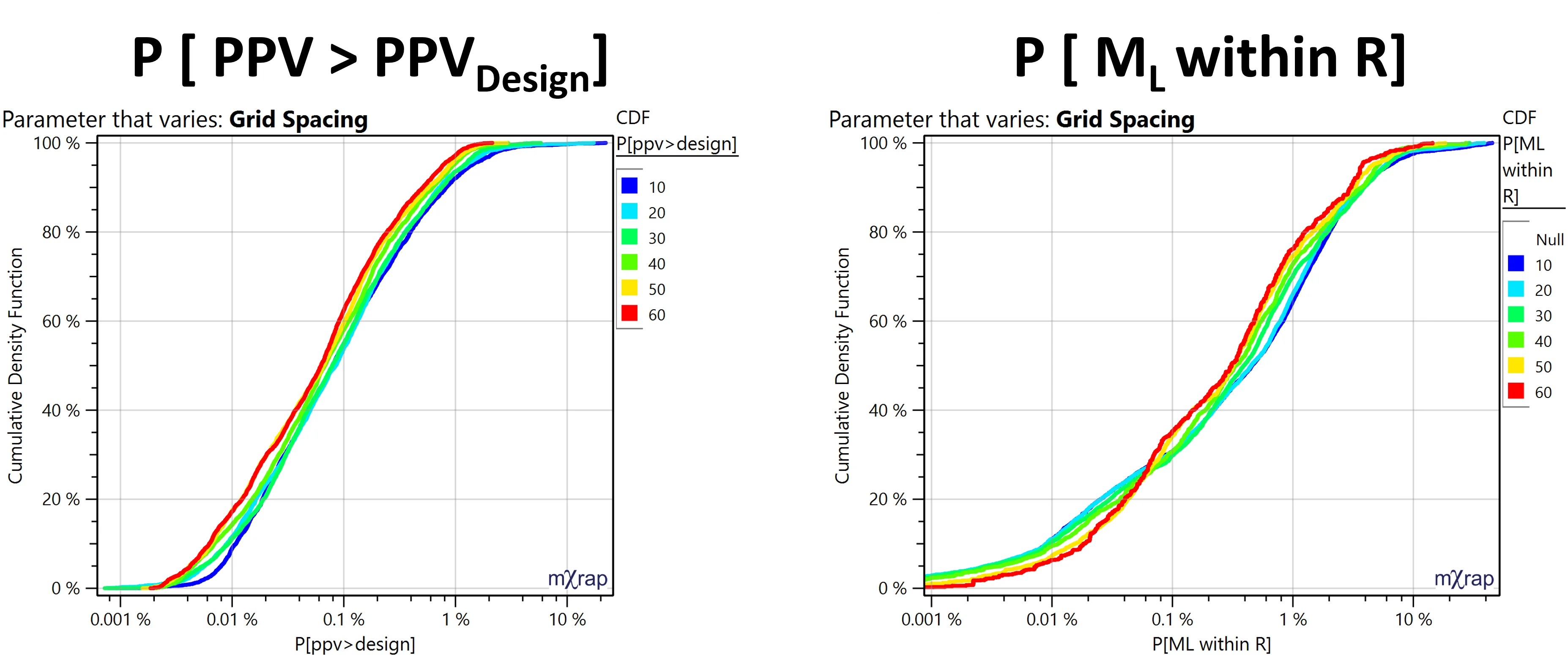 The effect of the input parameters variations can be visualised on the hazard on excavation, expressed by the P [ML within R] and P [PPV > PPVDESIGN]. The distribution of both parameters for each minode can be seen for each step (Figure 5).