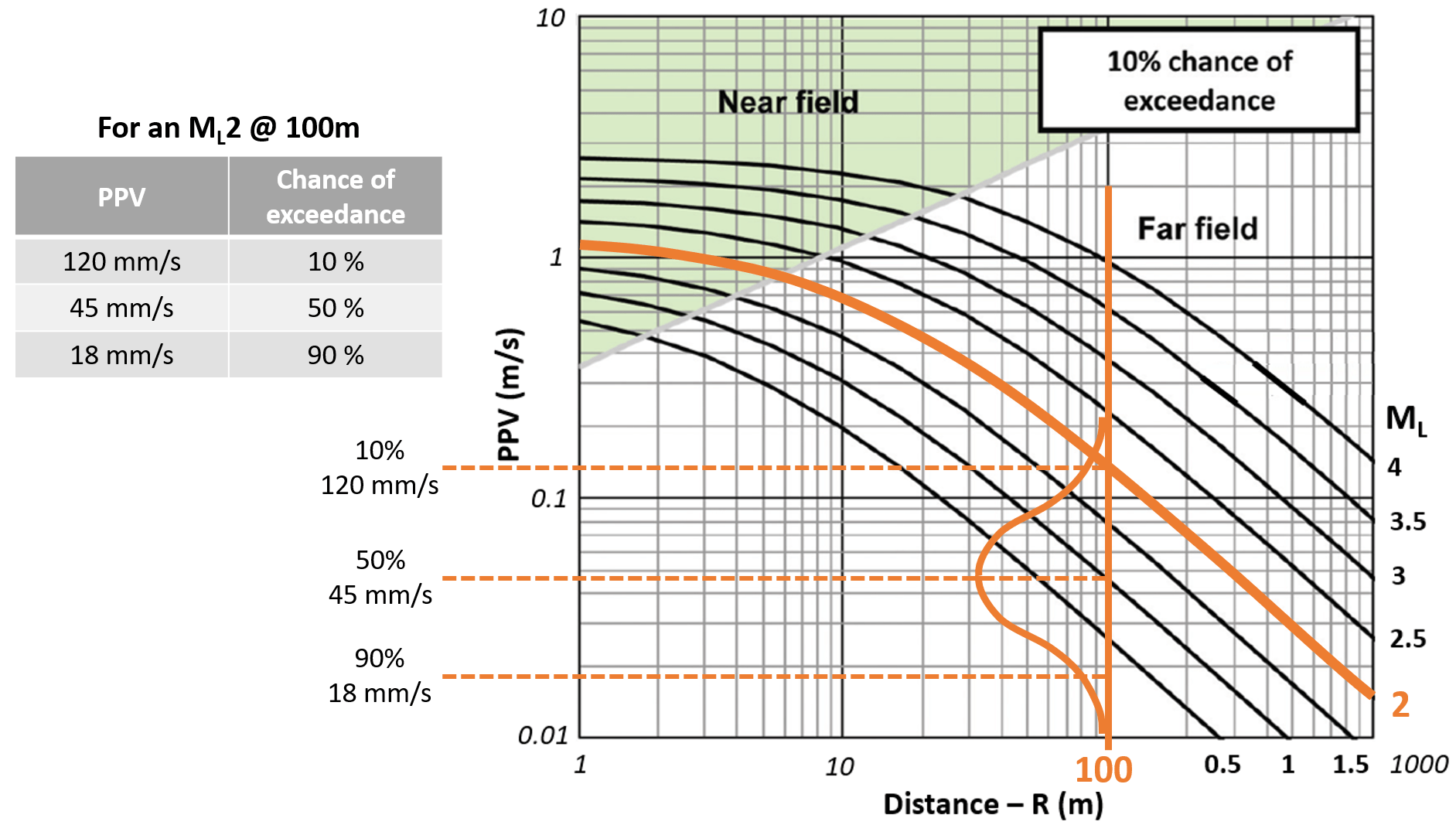 The wave motion from a seismic event through the rock mass is highly complex and uncertain. So, for a given ML and R, the PPV is not a single value but a probability distribution. This is illustrated below, for a ML2 at a distance of 100 m, the PPV distribution is plotted along with the 10th, 50th and 90th percentile values for probability of exceedance.